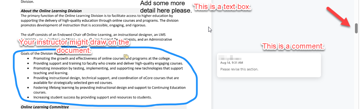 If you uploaded a file as the assignment, your instructor may have also left feedback on the document itself. You can see this feedback in the submission window. Be sure to scroll through your document to see any feedback your instructor has left on the document: