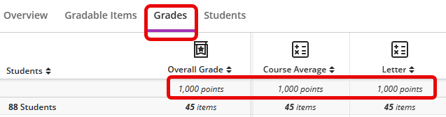 When calculating total columns, it is good practice to make sure all total columns match or calculate the way you intended. In this case, the instructor displayed points, the course average, and the letter grade to the students. The same drop rules were applied to each column. By clicking on the Grades link, the instructor can see the points possible for each column.
