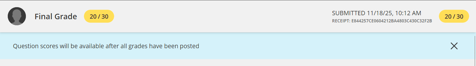 For example, if scores are only made available after the instructor has graded all items, you might see a message like this when you re-enter a quiz that had been submitted: