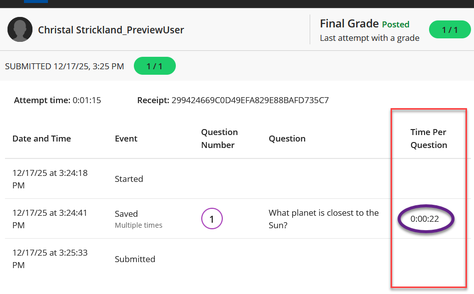 This will bring up the student's test attempt details. From this view, you may see how much time the student spent on a question in the "Time Per Question" column on the right.